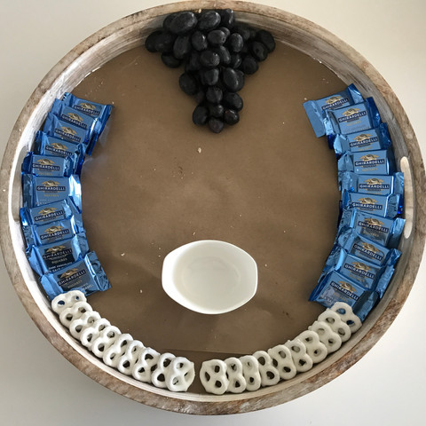 Step 3: Add 10 yogurt pretzels at the base of your board and place them facing each other. Add grapes to the top of your board.