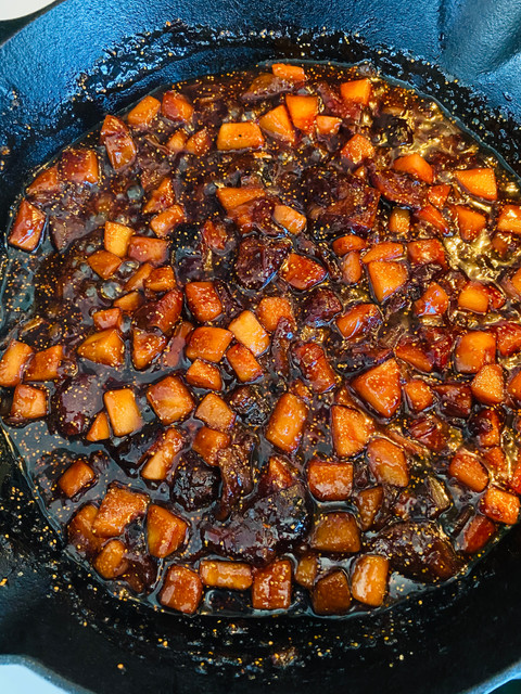 Step 6: Mix all the figs, apples, onions and balsamic vinegar together making sure everything is covered. Turn up the heat until it comes to a boil. Then reduce the heat and allow to cook for approximately 10 mins.