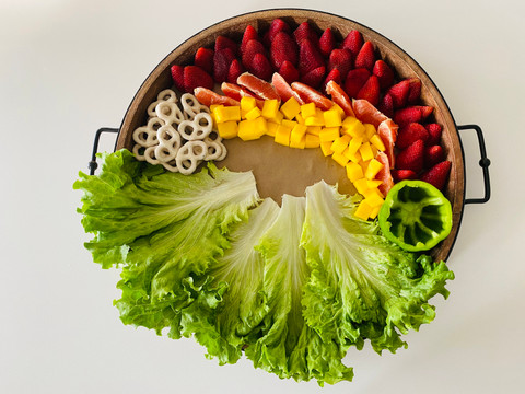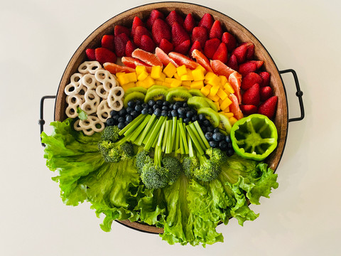 A healthy platter filled with an abundance of fruits and vegetables creates a colorful crudities to enjoy.